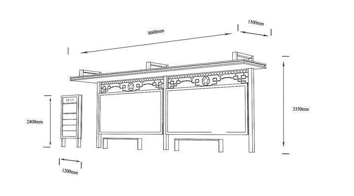 產(chǎn)品外觀 / PRODUCT DETAILS 產(chǎn)品信息 / PRODUCT INFO 【產(chǎn)品名稱】:中式古典候車亭GD6 【產(chǎn)品系列】:中式古典候車亭 【產(chǎn)品型號】:GD6 【產(chǎn)品規(guī)格】:長10800mm 寬1700mm 高2900mm 【產(chǎn)品材質(zhì)】:熱鍍鋅鋼板 【使用年限】:10-15年 【詳情致電】:181-5189-0417、157-5170-8886 備注:產(chǎn)品可根據(jù)用戶需求選用材質(zhì)、顏色及配件,個(gè)性化定制。 1、表面采用靜電噴塑(氟碳烤漆/搪瓷處理) 2、頂棚采用100*100*1.5mm、100*150*2mm鍍鋅管,3mm鍍鋅板激光切割件、1.5mm鍍鋅板焊接骨架,鋪1mm鍍鋅板(10mm陽光板) 3、立柱采用150*150*3mm鍍鋅管 4、箱體采用1.5mm鍍鋅板折彎焊接成型,門框采用全玻鋁合金型材,視窗采用6mm鋼化玻璃 5、照明電器采用LED燈粒 產(chǎn)品尺寸 / PRODUCT SIZE 關(guān)于輝盛 / 為社會分擔(dān)責(zé)任,為客戶創(chuàng)造價(jià)值 宿遷輝盛廣告設(shè)備有限公司是一家集設(shè)計(jì)、研發(fā)、生產(chǎn)為一體的城市公共設(shè)施生產(chǎn)型企業(yè)。主要產(chǎn)品有:候車公交亭、公交站臺、閱報(bào)欄、路名牌、垃圾箱、燈箱等市政設(shè)施系列產(chǎn)品和工程配套設(shè)施系列產(chǎn)品,現(xiàn)有高級技師30多人,高級職稱設(shè)計(jì)人員10人,是一家具有自主開發(fā)和設(shè)計(jì)能力的以公交亭、智能公交為主導(dǎo)的綜合性城市公共設(shè)施制造企業(yè)。為了進(jìn)一步改善生產(chǎn)工藝,提高產(chǎn)品質(zhì)量,公司引進(jìn)了先進(jìn)生產(chǎn)設(shè)備,包括立臥式加工中心,工業(yè)涂裝流水線,CNC車床,線切割機(jī),大型數(shù)控板機(jī),數(shù)控折邊機(jī),數(shù)控沖孔機(jī)床,大型折彎機(jī)等。公司還專門成立了產(chǎn)品研發(fā)部門,現(xiàn)每年自主開發(fā)或應(yīng)客戶要求設(shè)計(jì)推出多款新產(chǎn)品。 榮譽(yù)資質(zhì) / ENTERPRISE HONOR