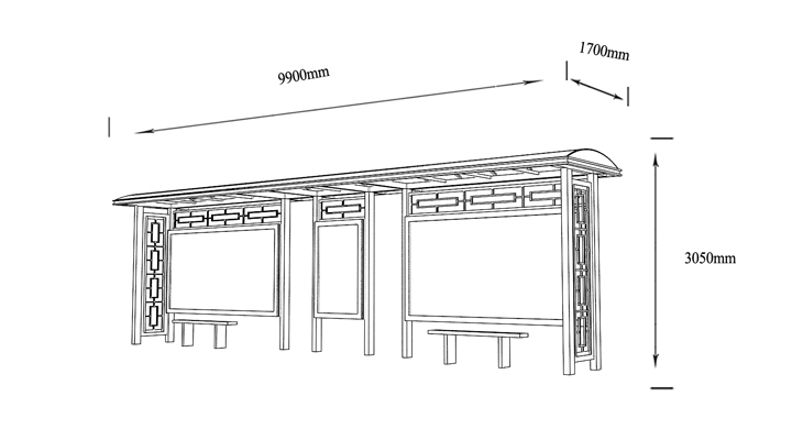 產(chǎn)品外觀 / PRODUCT DETAILS 產(chǎn)品信息 / PRODUCT INFO 【產(chǎn)品名稱(chēng)】:中式古典候車(chē)亭GD3 【產(chǎn)品系列】:中式古典候車(chē)亭 【產(chǎn)品型號(hào)】:GD3 【產(chǎn)品規(guī)格】:長(zhǎng)10800mm 寬1700mm 高2900mm 【產(chǎn)品材質(zhì)】:熱鍍鋅鋼板 【使用年限】:10-15年 【詳情致電】:181-5189-0417、157-5170-8886 備注:產(chǎn)品可根據(jù)用戶(hù)需求選用材質(zhì)、顏色及配件,個(gè)性化定制。 1、表面采用靜電噴塑(氟碳烤漆/搪瓷處理) 2、頂棚采用100*100*1.5mm、100*150*2mm鍍鋅管,3mm鍍鋅板激光切割件、1.5mm鍍鋅板焊接骨架,鋪1mm鍍鋅板(10mm陽(yáng)光板) 3、立柱采用150*150*3mm鍍鋅管 4、箱體采用1.5mm鍍鋅板折彎焊接成型,門(mén)框采用全玻鋁合金型材,視窗采用6mm鋼化玻璃 5、照明電器采用LED燈粒 產(chǎn)品尺寸 / PRODUCT SIZE 關(guān)于輝盛 / 為社會(huì)分擔(dān)責(zé)任,為客戶(hù)創(chuàng)造價(jià)值 宿遷輝盛廣告設(shè)備有限公司是一家集設(shè)計(jì)、研發(fā)、生產(chǎn)為一體的城市公共設(shè)施生產(chǎn)型企業(yè)。主要產(chǎn)品有:候車(chē)公交亭、公交站臺(tái)、閱報(bào)欄、路名牌、垃圾箱、燈箱等市政設(shè)施系列產(chǎn)品和工程配套設(shè)施系列產(chǎn)品,現(xiàn)有高級(jí)技師30多人,高級(jí)職稱(chēng)設(shè)計(jì)人員10人,是一家具有自主開(kāi)發(fā)和設(shè)計(jì)能力的以公交亭、智能公交為主導(dǎo)的綜合性城市公共設(shè)施制造企業(yè)。為了進(jìn)一步改善生產(chǎn)工藝,提高產(chǎn)品質(zhì)量,公司引進(jìn)了先進(jìn)生產(chǎn)設(shè)備,包括立臥式加工中心,工業(yè)涂裝流水線(xiàn),CNC車(chē)床,線(xiàn)切割機(jī),大型數(shù)控板機(jī),數(shù)控折邊機(jī),數(shù)控沖孔機(jī)床,大型折彎?rùn)C(jī)等。公司還專(zhuān)門(mén)成立了產(chǎn)品研發(fā)部門(mén),現(xiàn)每年自主開(kāi)發(fā)或應(yīng)客戶(hù)要求設(shè)計(jì)推出多款新產(chǎn)品。 榮譽(yù)資質(zhì) / ENTERPRISE HONOR